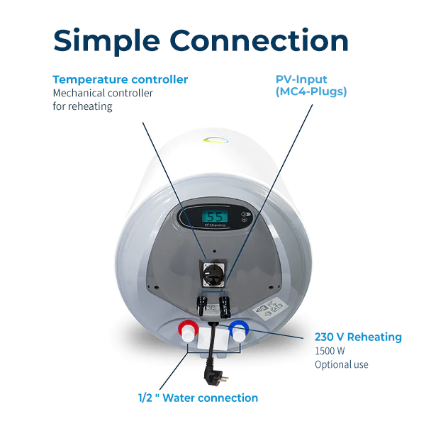 Met maximaal 550 W verwarmt de fotovoltaïsche hybrideboiler het water via fotovoltaïsche energie. Om ook op bewolkte dagen voldoende warm water beschikbaar te hebben, kan er tot wel 2.000 Wp fotovoltaïsche energie worden aangesloten en/of er kan gebruik worden gemaakt van de elektrische naverwarming van 230 V 1.500 W naverwarming