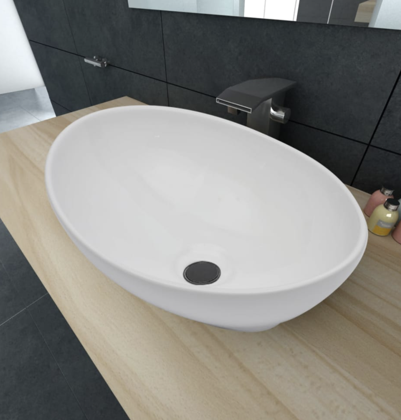 Deze ovale wastafel van hoogwaardig keramiek is een stijlvolle toevoeging aan elke badkamer en toilet. Zijn hoogglans afwerking geeft hem een modern maar elegant ontwerp.