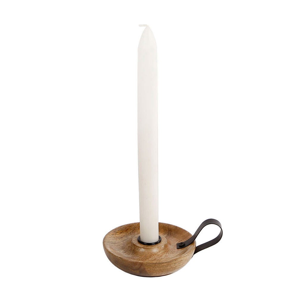 Mangohouten kandelaar senhouder geschikt voor 1 lange kaars. De ronde houder heeft een stalen handvat, zodat je de kandelaar gemakkelijk kunt verplaatsen.